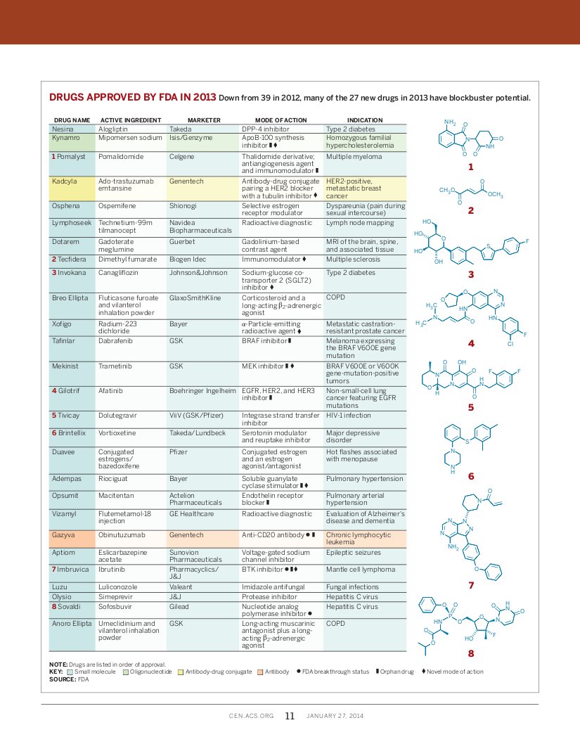 The new drug approvals for 2013 were mostly cancer drugs and drugs for orphan diseases.